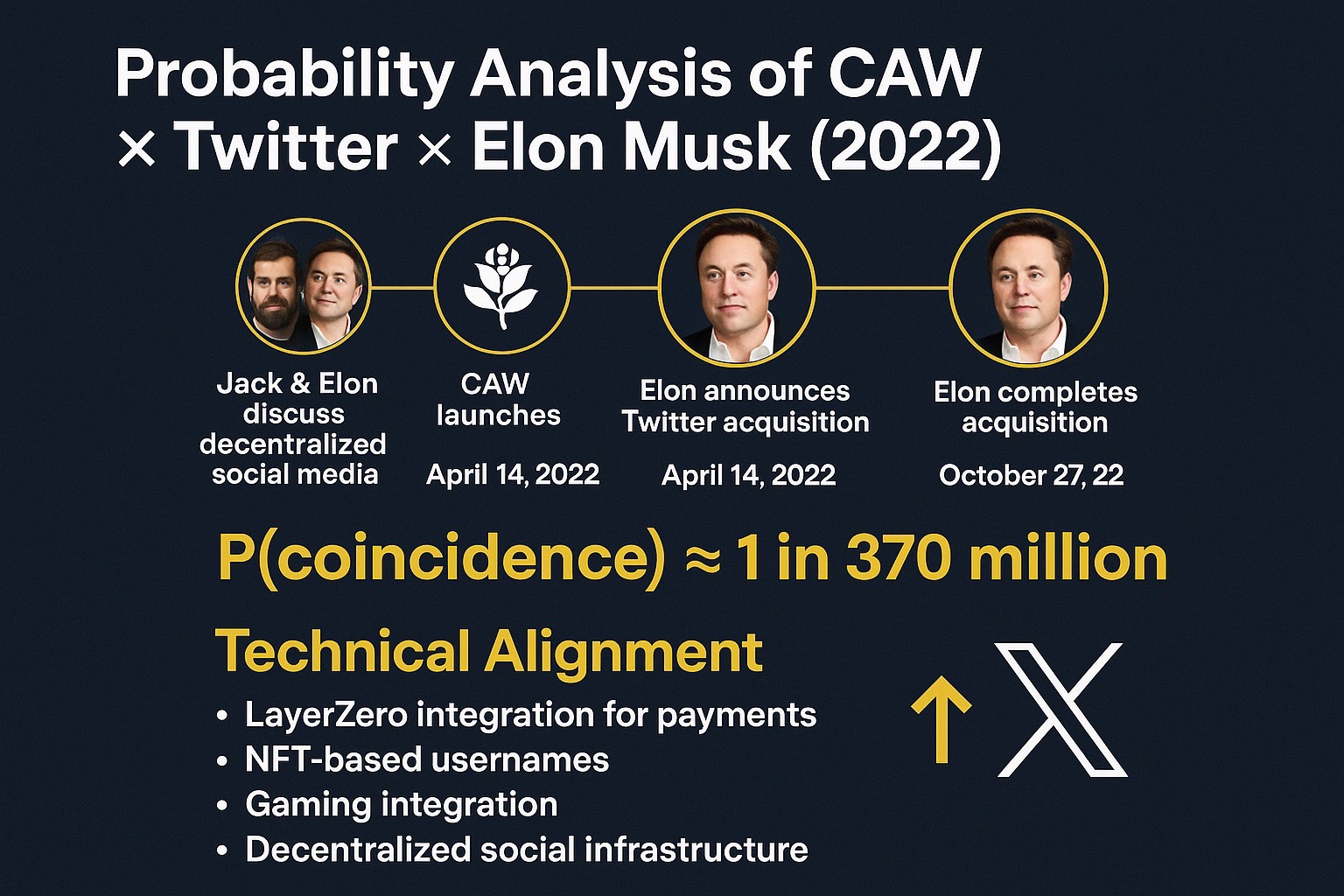 On April 14, 2022, CAW’s stealth deployment and Elon’s Twitter acquisition announcement occurred on the exact same day — an event with odds of roughly 1 in 370 million.